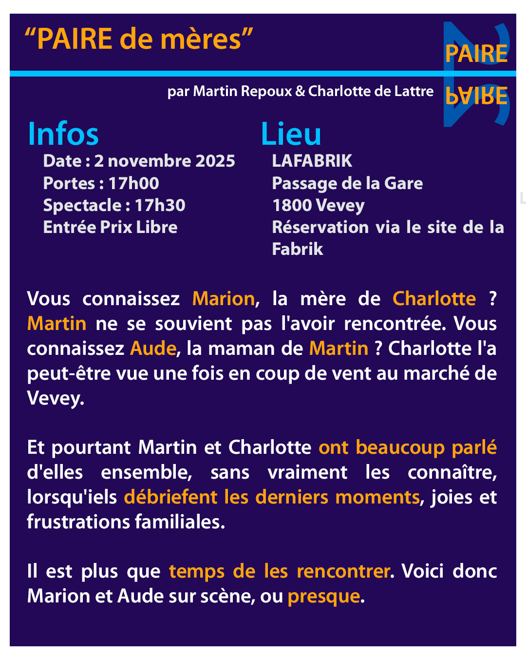 Dimanche 2 novembre 2025 : “PAIRE de mères” par Martin Repoux & Charlotte de Lattre